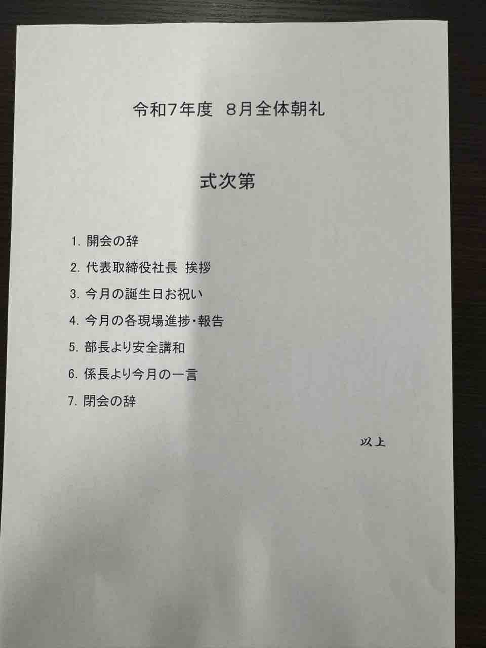 下記のとおり、8月の全体朝礼を執り行いましたのでご報告いたします。