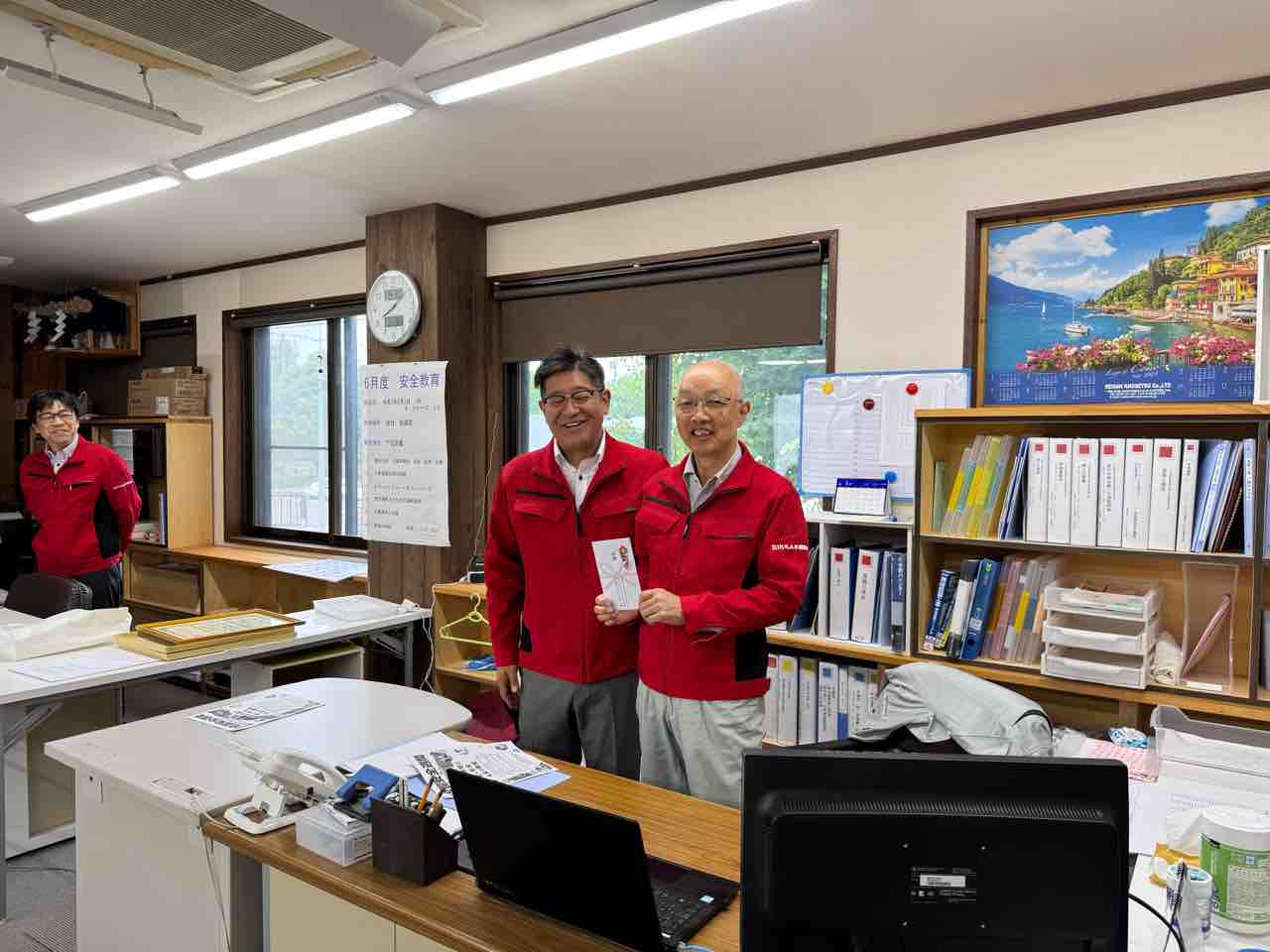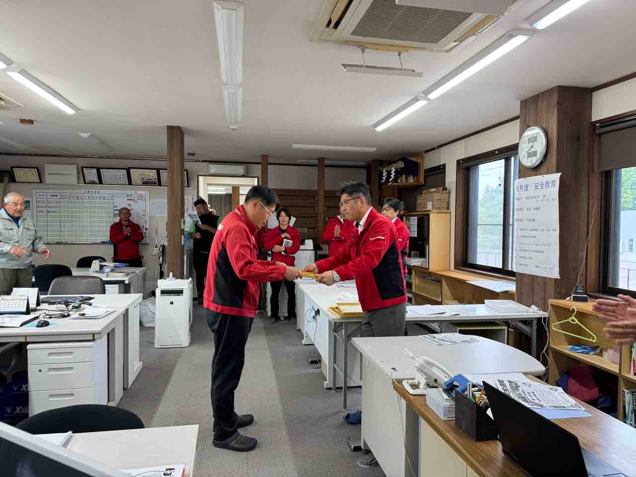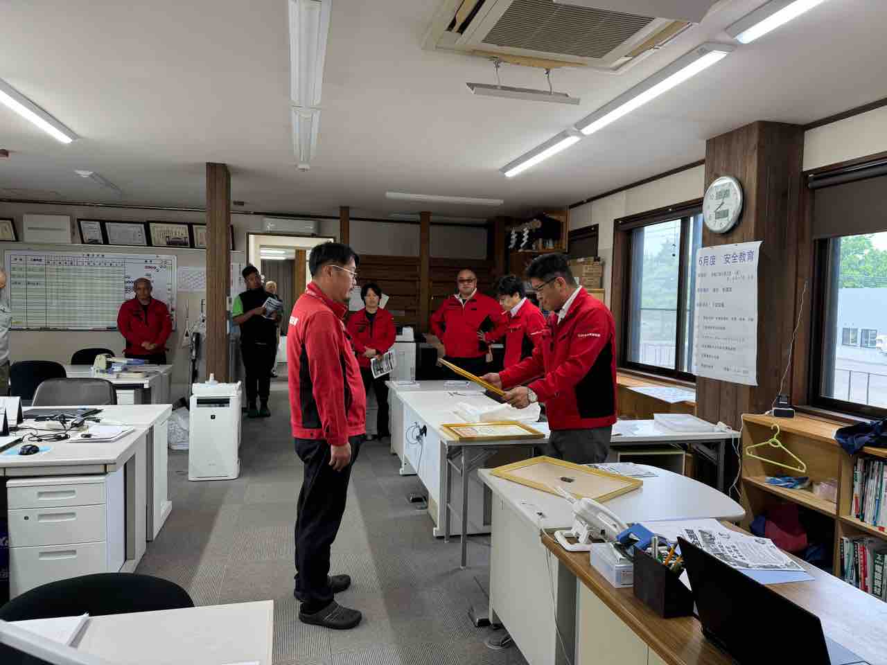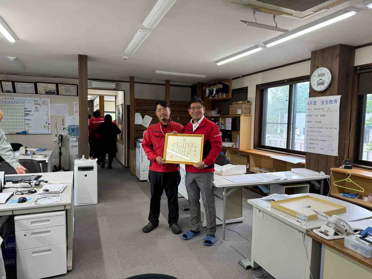 また、うれしいご報告として、先日「北広島市建設工事優良施工業者表彰」を受賞した氏家係長への表彰式を行いました。改めて表彰状と金一封を贈呈し、社員一同でその功績を称えました。