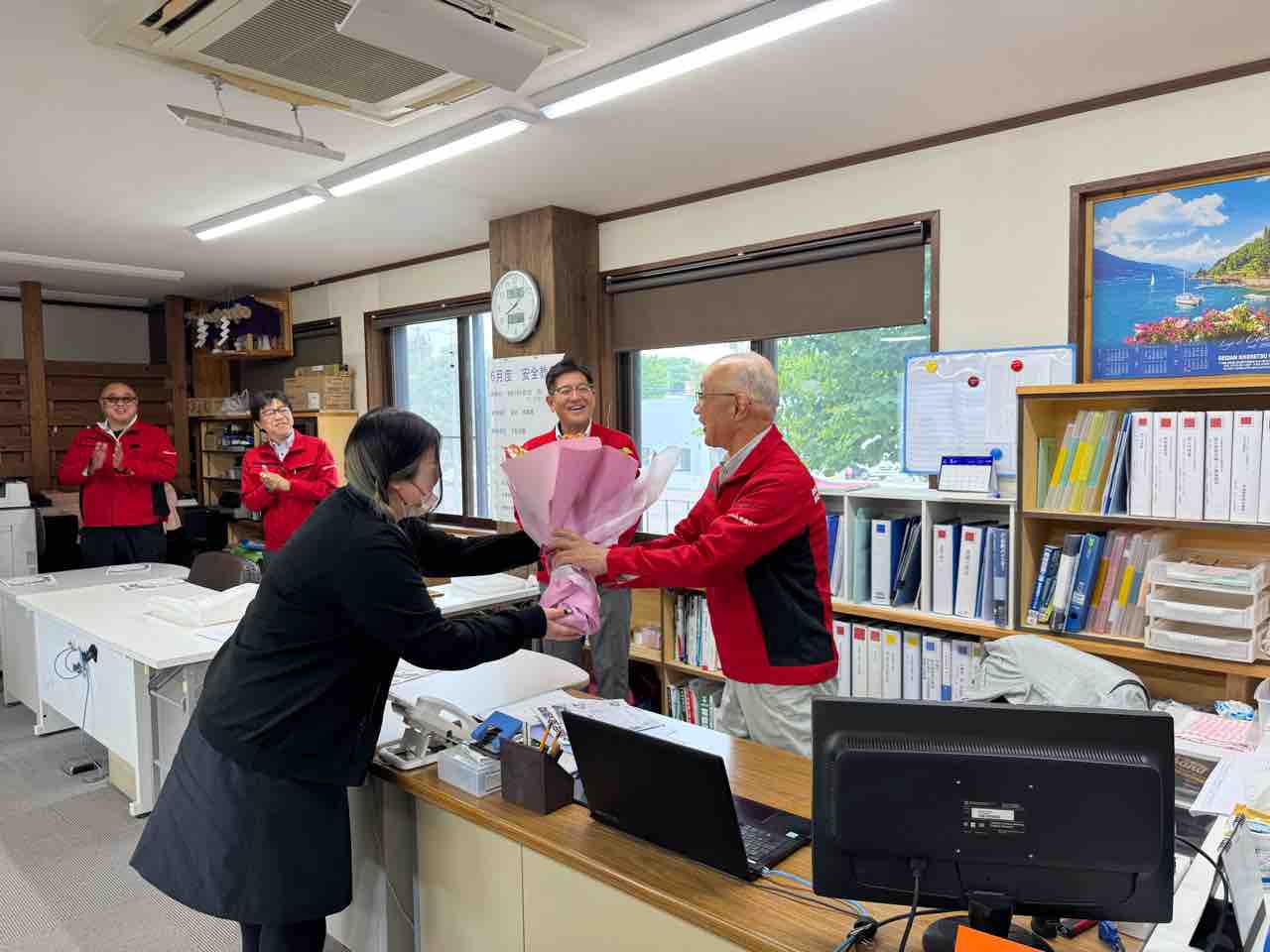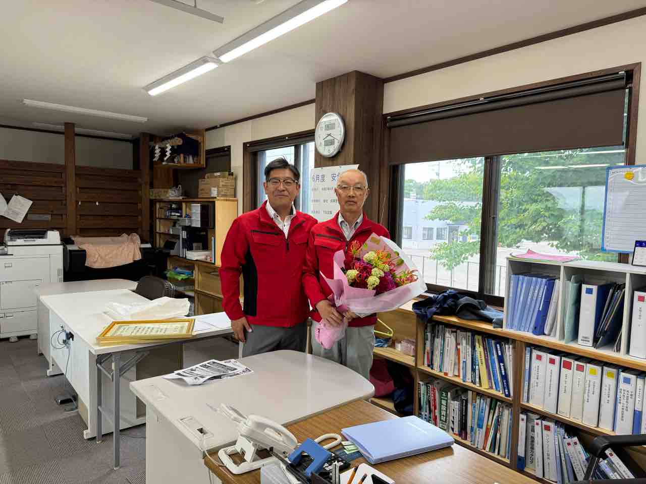 さらに、長年にわたり部長職として会社を支えてくださった山下部長の退官式も執り行いました。10年間のご尽力に心から感謝を申し上げ、花束と感謝の気持ちをお渡ししました。今後は職員として、引き続き後進の指導・育成にご尽力いただく予定です。